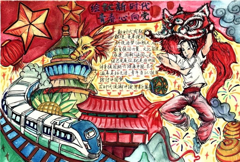 中国特色社会主义进入新时代,这是我国发展新的历史方位。在中国共产党的带领下,人民美好生活需要日益广泛、社会生产力水平总体上显著提高、社会生产能力在很多方面进入世界前列。为深入学习贯彻党的二十大精神,生动展现新时代青年学子的理想信念与责任担当,艺体处思政学科组策划了主题手抄报大赛。