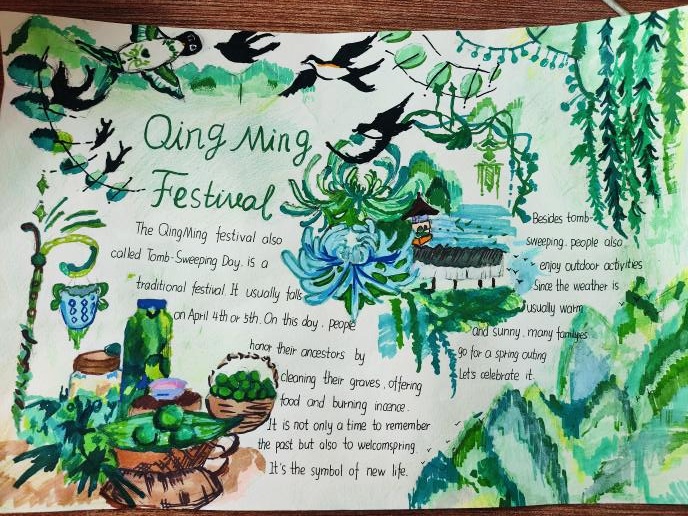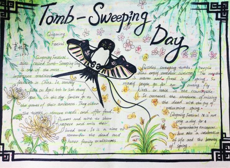 本次活动得到高一、高二年级学生的积极响应与踊跃参与。筹备过程中,同学们主动查阅各类资料,反复打磨文稿内容,用心开展创意构思,以英语为语言载体,围绕中国传统民俗、经典传统艺术等核心主题,进行手抄报版面设计与内容创作。创作中,春节屠苏酒里承载的阖家欢悦、清明踏青追思的民俗意蕴、各类传统民俗文化与民间艺术特色,都被同学们以流畅地道的英语语句生动呈现,实现了中华优秀传统文化与英语知识的巧妙融合。每一份手抄报都独具匠心、亮点纷呈,既充分展现了同学们扎实的英语语言表达功底,也真挚传递出新时代学子对中华优秀传统文化的由衷热爱与文化传承之心。